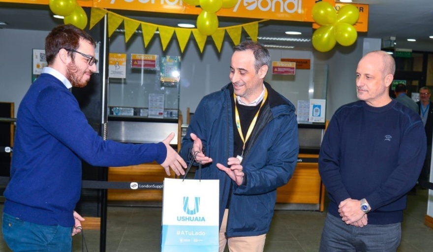 La Municipalidad de Ushuaia a través de la Secretaría de Turismo dejó inaugurada la nueva ruta de Fly Bondi Ushuaia- Calafate junto a autoridades de la línea aérea. En nombre de la ciudad, el coordinador de Asuntos Internaciones de la Secretaría de Turismo Carlos Henninger entregó presentes al gerente comercial de Flybondi Javier Soto y al Coordinador de Asuntos públicos Andrés Rojas.