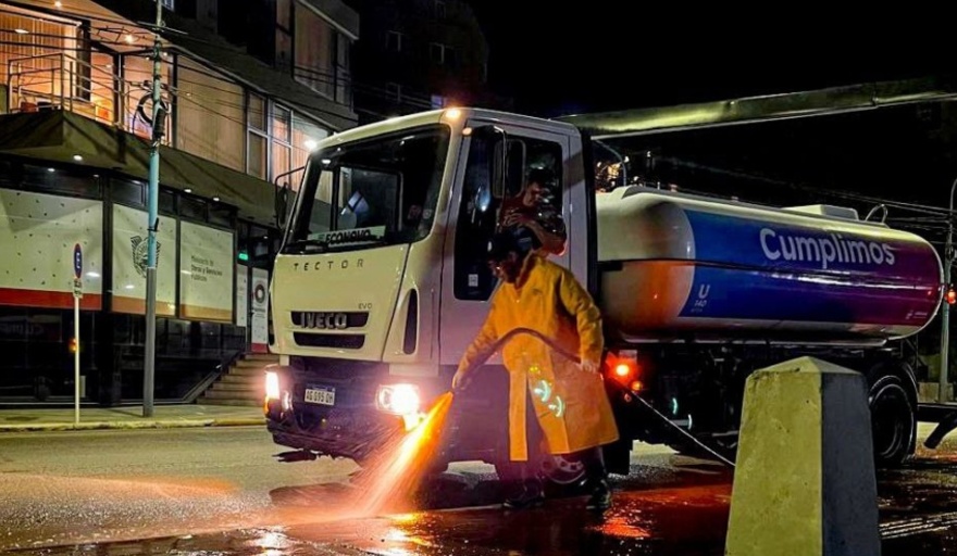 Personal de la Secretaría de Medio Ambiente y Desarrollo Sustentable de la Municipalidad de Ushuaia, y de la empresa Agrotécnica Fueguina, lleva adelante trabajos de limpieza nocturna en avenidas, calles y veredas del sector céntrico de la ciudad.