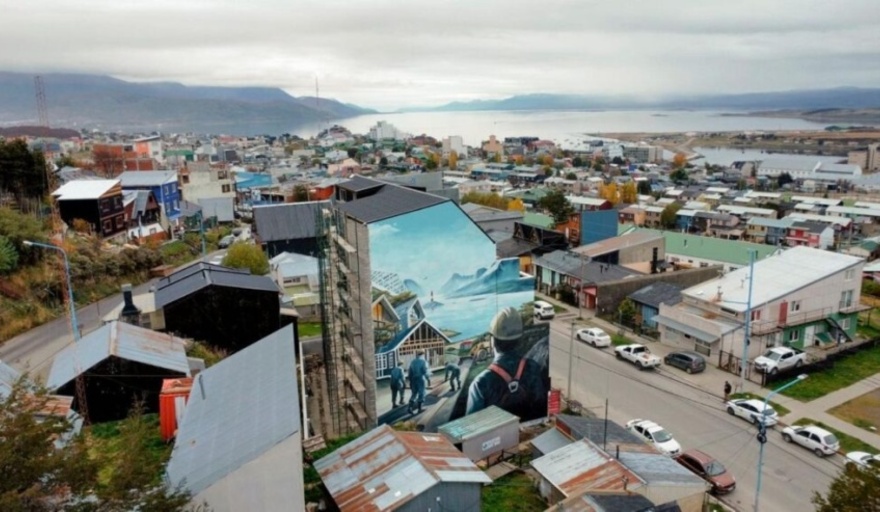 La obra fue un encargo de la Corporación Costa Sur y está emplazada en Av. Leandro Alem 1895, en un sector de fuerte crecimiento urbano. Desde una pared de gran altura, la escena muestra a obreros construyendo una casa de madera, mientras en primer plano un trabajador de espaldas contempla la obra. El mural funciona como un tributo visual al trabajo, los oficios y la identidad arquitectónica cambiante de Ushuaia.