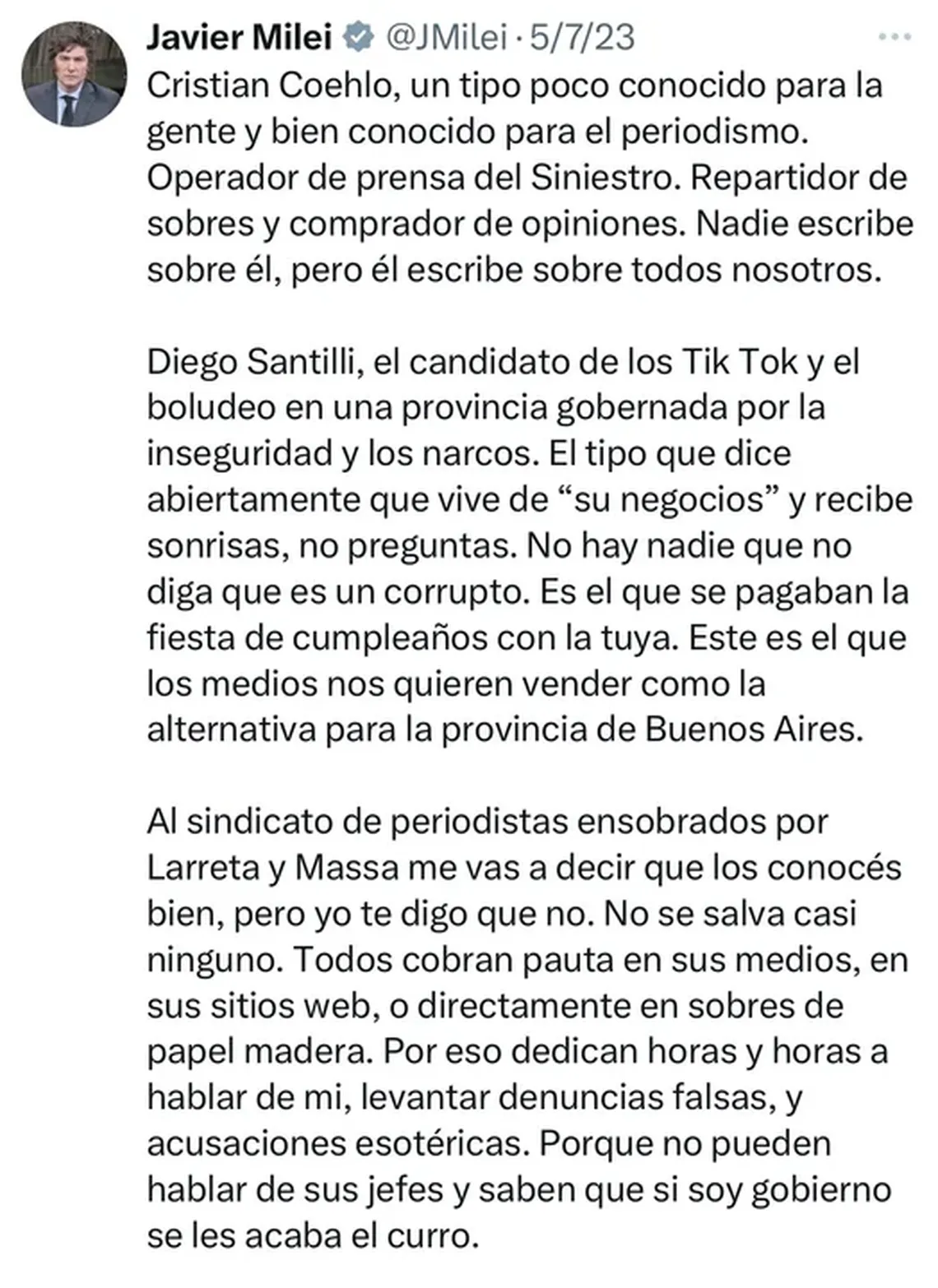 Allá por 2023, el libertario armó un hilo de X contra “la casta”, en donde apuntó contra varios políticos. Uno de ellos fue el por entonces precandidato a gobernador bonaerense por el PRO, al que llamó “el candidato de los TikTok y el boludeo en una provincia gobernada por la inseguridad y los narcos”.