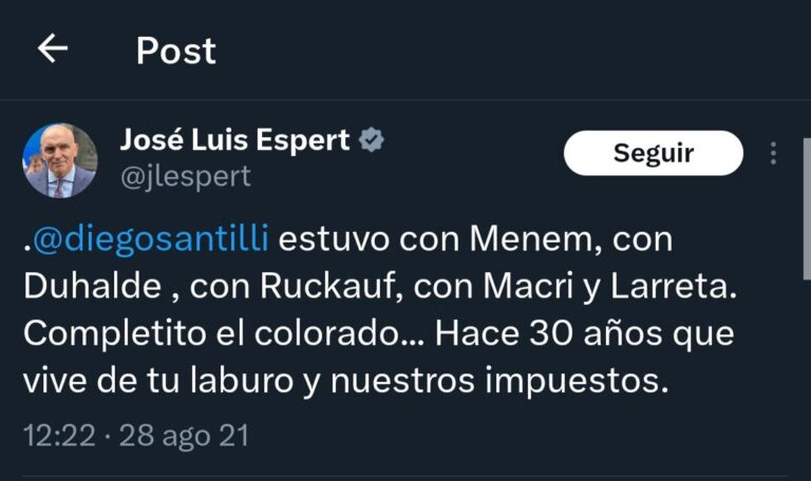 Por su parte, Espert también disparó contra Santilli en el pasado. En 2021, el ahora excandidato libertario, cuyo mandato (y fueros) terminan en diciembre, tuiteó: "Santilli estuvo con Menem, con Duhalde, con Ruckauf, con Macri y Larreta. Completito el colorado... Hace 30 años que vive de tu laburo y nuestros impuestos".