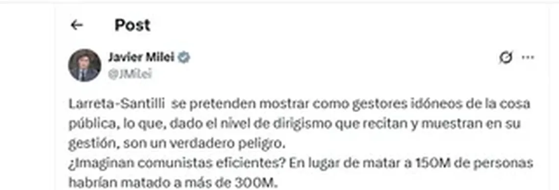 En otra publicación, el ahora presidente, señaló: "Larreta-Santilli se pretenden mostrar como gestores idóneos de la cosa pública, lo que, dado el nivel de dirigismo que recitan y muestran en su gestión, son un verdadero peligro. ¿Imaginan comunistas eficientes? En lugar de matar a 150M de personas habrían matado a más de 300M".