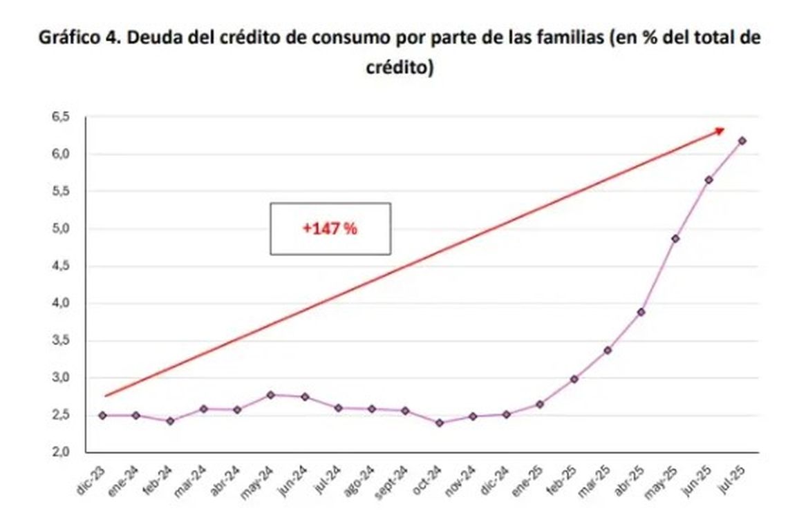 Esta dinámica sugiere que una "proporción creciente de los hogares recurre al endeudamiento para afrontar consumos básicos mensuales, como alimentos, productos de higiene y artículos de primera necesidad", señaló el documento. Esto evidencia que una mayor porción de los ingresos se destina al pago de servicios, en un contexto en el que los salarios, en promedio, apenas superan la inflación.