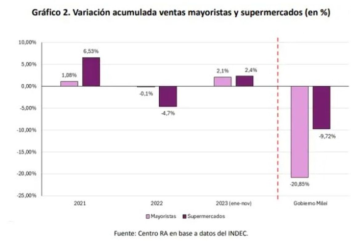 Este comportamiento se aprecia con mayor claridad al observar las caídas acumuladas. Desde el inicio del actual gobierno, los autoservicios mayoristas registran una contracción acumulada de 21%, lo que implica un aumento de más de 2 puntos porcentuales respecto de mayo (último informe). Por su parte, las ventas de los supermercados acumulan una caída de 9%, ampliada en casi 2 puntos porcentuales en relación con mayo.