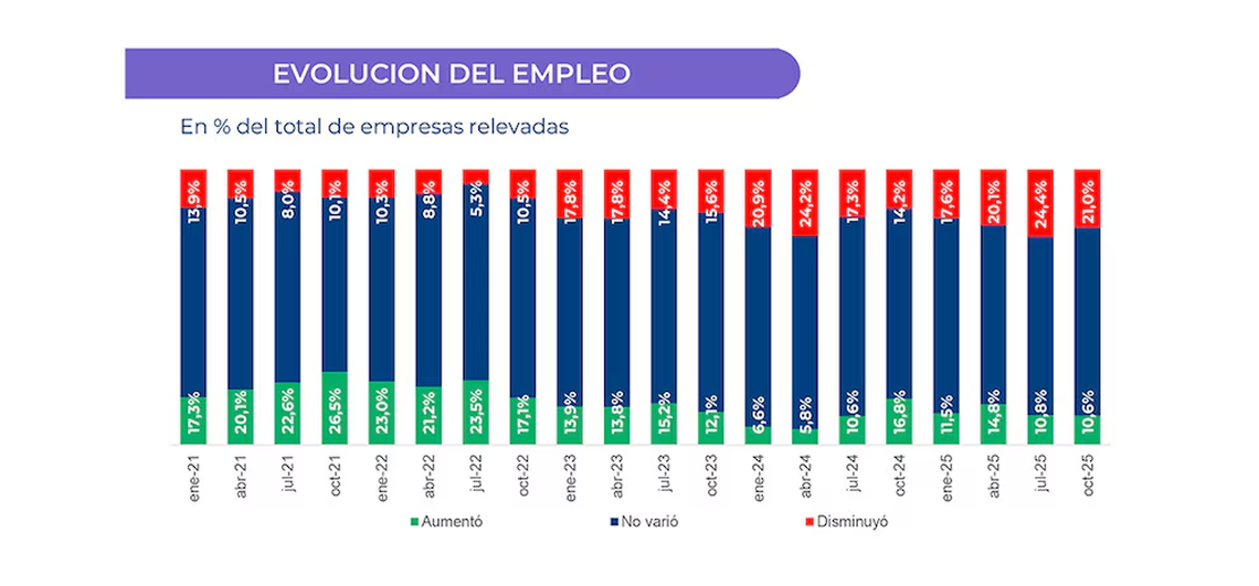 El 21,0% de las empresas redujo su personal, una cifra que permaneció entre las más elevadas de los relevamientos recientes. La proporción de empresas que adoptó reducción de turnos laborales ascendió al 23,5%, mientras el 7,7% aplicó suspensiones, decisiones que crecieron de manera sostenida a lo largo de los últimos cinco informes. Estos movimientos afectaron por igual a Micro, Pequeñas, Medianas y Grandes.