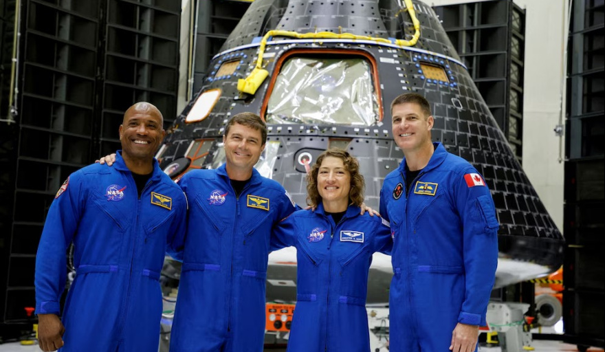 Las astronautas de Artemis II, Victor Glover, pilot, Reid Wiseman, Christina Hammock Koch yJeremy Hansen, posan con la cápsula Orión que los transportará a la Luna (REUTERS/Joe Skipper/File Photo)