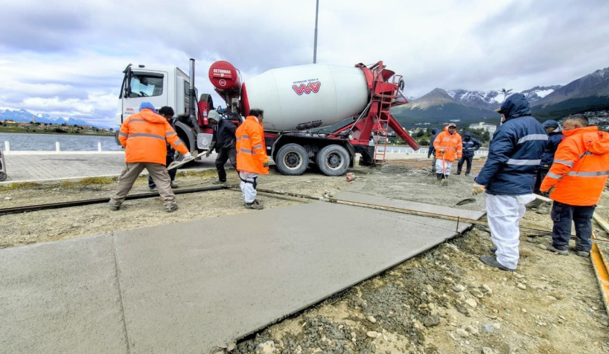 Actualmente, se avanza en tareas de hormigonado de veredas y bicisenda, con más de 200 metros cúbicos de hormigón, la construcción de bolardos ejecutados in situ y el hormigonado de bases para los postes de iluminación.