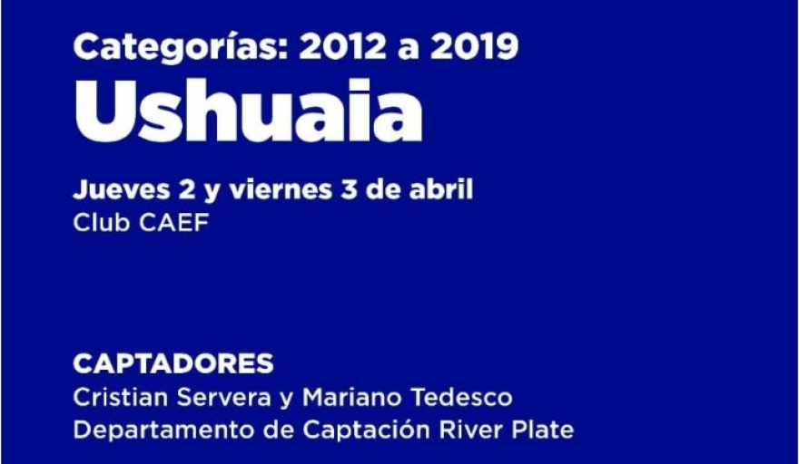 El Instituto Municipal de Deportes de Ushuaia informa que las jornadas de captación de fútbol formativo que llevará adelante Club Atlético River Plate se desarrollarán íntegramente en la ciudad de Ushuaia.