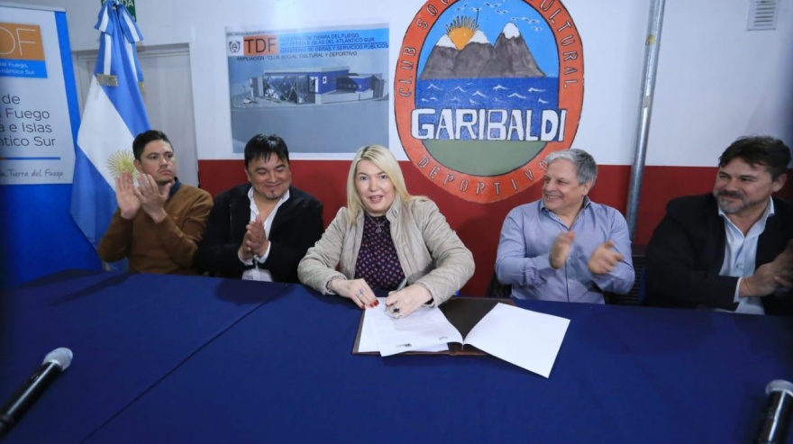 La gobernadora Rosana Bertone firmó este miércoles en Río Grande junto al vicepresidente del Instituto Provincial de Vivienda Favio Escobar, al ministro de Obras y Servicios Públicos, Luis Vázquez y el presidente del Club Social, Deportivo y Cultural "Luis Garibaldi" Roque Córdoba, la cesión del terreno y el convenio para la construcción del nuevo gimnasio que albergará toda actividad deportiva de la institución.