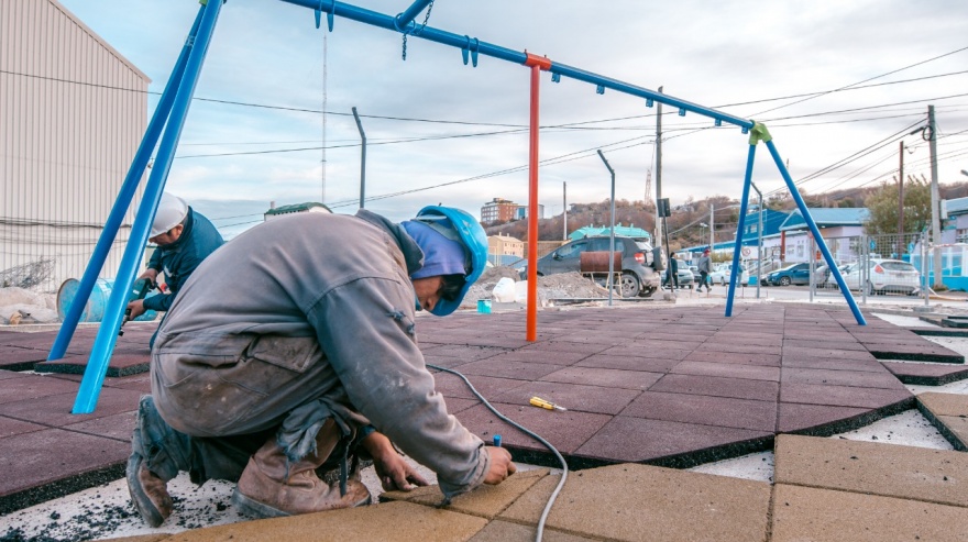 La Municipalidad de Ushuaia comenzó con la colocación del piso de caucho en la nueva plaza del barrio Mirador de los Andes, conocido también como 640 viviendas, que además contará con juegos inclusivos, con hamacas para sillas de ruedas, nuevo mobiliario y luces Led.