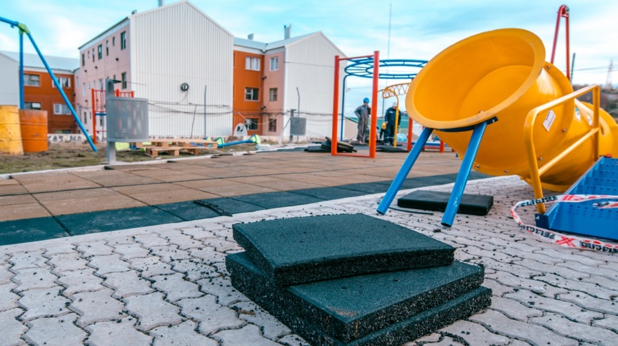 La Municipalidad de Ushuaia coloca piso de caucho en la nueva plaza del barrio 640 viviendas, que además contará con juegos inclusivos, con hamacas para sillas de ruedas, nuevo mobiliario y luces Led.